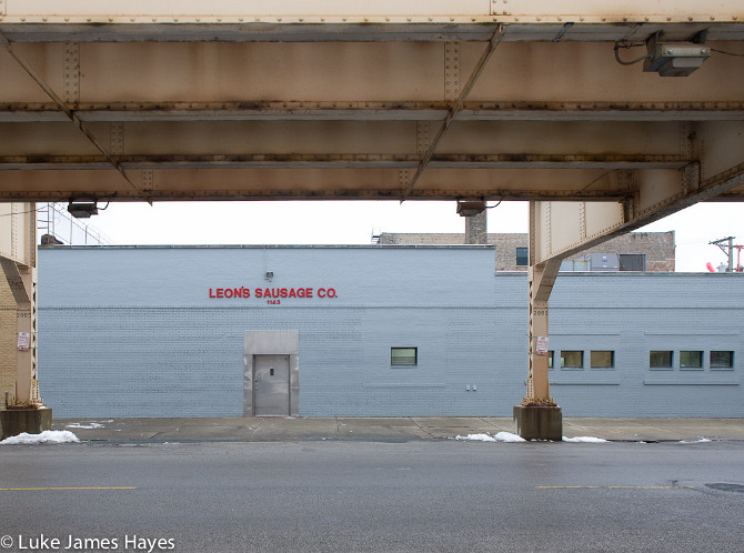 The use of a warm filter gives Chicago the tone of a 1970s film. In some photographs, characters and an underlying narrative are implied. As a longhaired woman walks towards Dunkin’ Donuts, trousers slightly flared, a classic diner scene is about to unfold. Glimpsed under the highline, Leon’s hints darkly at being more than a sausage factory. Photographs of snow on an anonymous neighbourhood, or on a line of milk vans waiting at the depot, tap into the same myth of big-city American culture as the films of Wim Wenders – like his work, the images here share some of that alienated fascination of a European looking through a lens into a very different, yet strangely familiar, urban landscape.