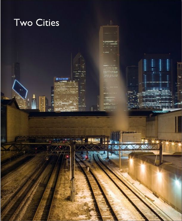Two Cities is a series of photographs by Luke Hayes. He introduces Chicago and Tokyo from high above: the Burnham Plan laid out beneath Sears Tower and the view east from Roppongi Hills. Looking down, life in Chicago is reduced to a band of light that moves along horizontals and verticals and stops to sleep and work in the grey spaces between. The grid gives everything the appearance of order: walking north-south down State Street, moving up and down tall buildings. Life is lived within the limits of a bigger plan, set against glimpses of the free, open expanse of Lake Michigan.