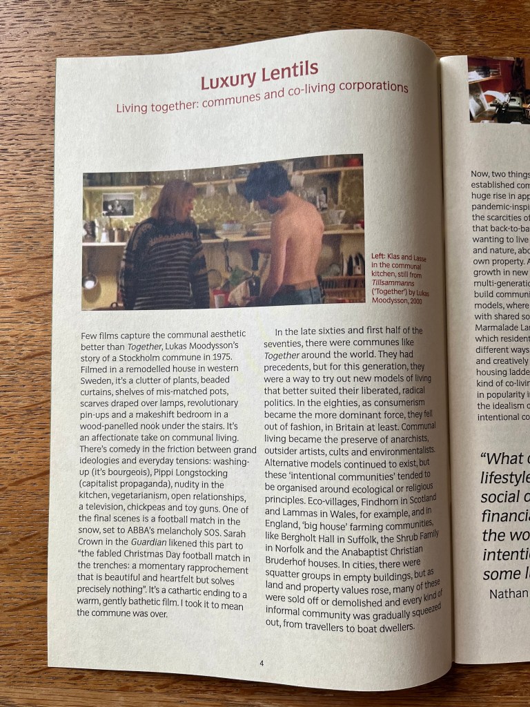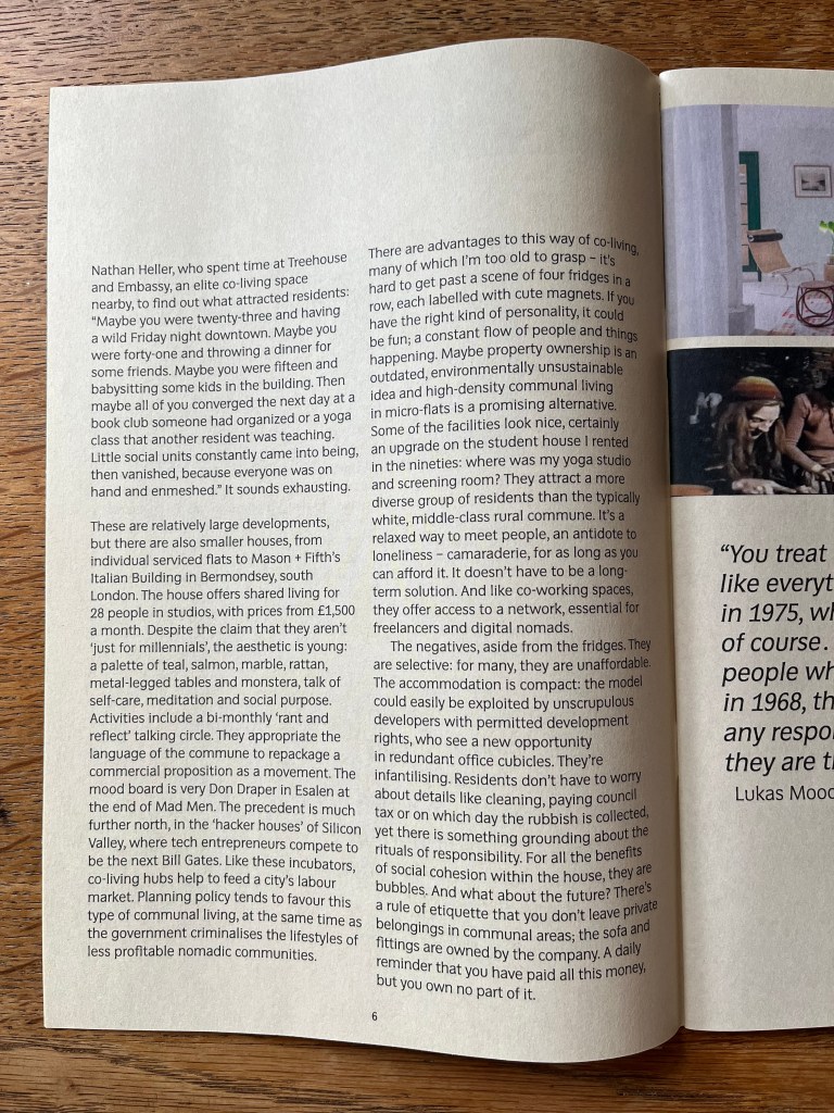 Revisiting Communal, a zine I made during the pandemic, makes me cringe – but co-living schemes are in the news again… I had been collecting snippets of ideas that related to the idea of communal living, or informal systems of sharing and negotiation, as well as examples where this had been corrupted. Like a geodesic dome used as a climbing frame – great – but also as plastic booths on astroturf in a pub garden. Or the long tables in a restaurant that can seat twice as many covers as individual ones in the same space, but it’s sociable and French of course, not tight margins. Or the council that has wardens hide in a car park to catch and post fines to people that accept a ticket with time left on it from a kind stranger. I’ll try and share more of the examples somewhere perhaps.