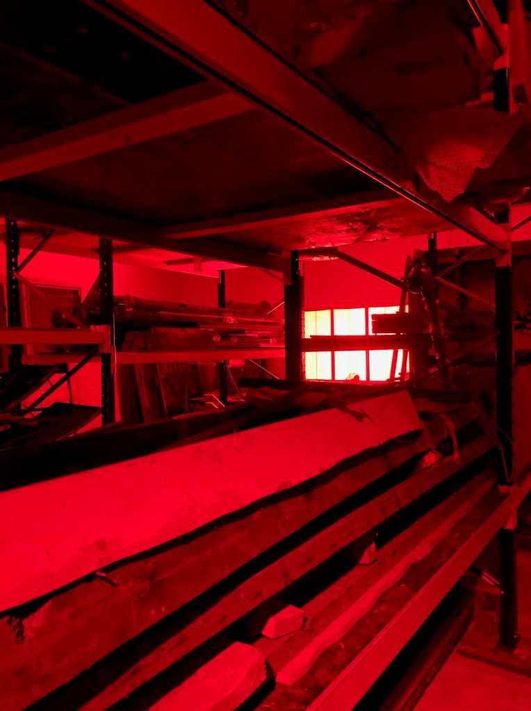 Another large-scale installation, I, Imposter, 2011, is lit by the same red safelight of a dark room – the unsettling glow becoming a Nelson trope. You can still make out the objects on the racks of planks, fixtures and gates and old doors lined up against the wall. It’s a warehouse for a previous work, recycled as a new one. Presumably one of the challenges of working with big found objects, like blown out tyres and factory fittings, is storage. Apparently the answer to that is Orpington.