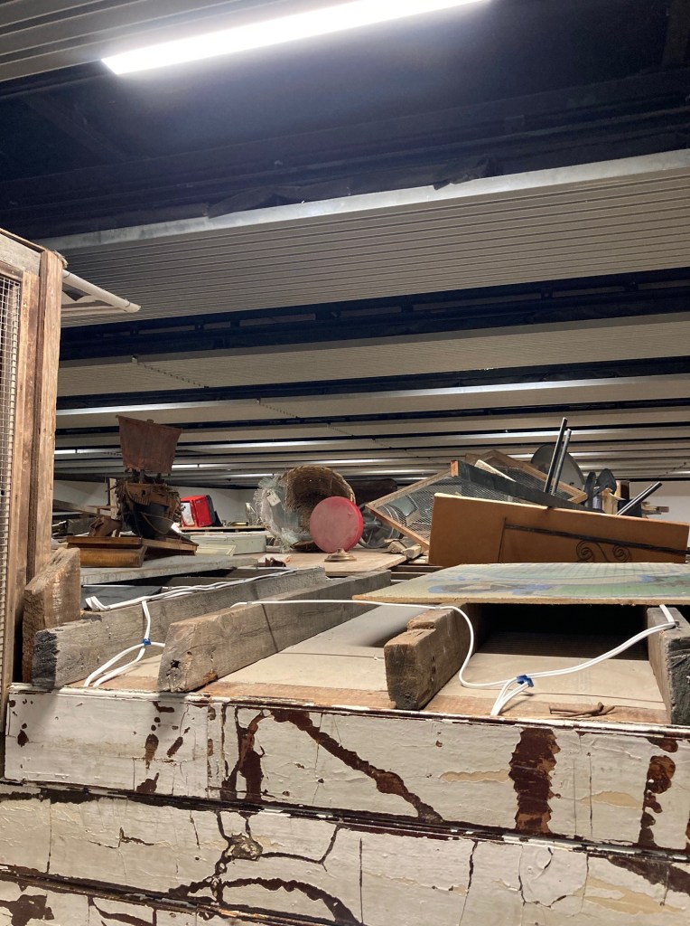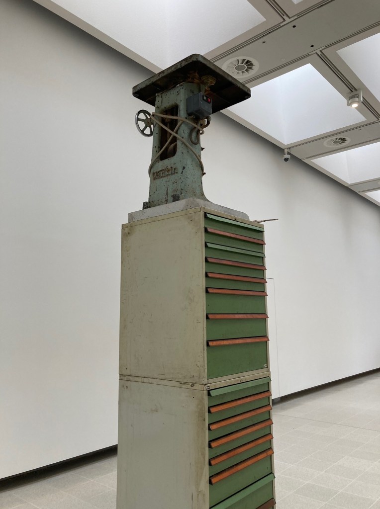 I study the other visitors circling The Asset Strippers’ metal trays and iron sander. A stylish older art couple; a glamorous woman, no stranger to mornings browsing London’s latest immersive offerings; an urbane, writerly looking man. Do they know Loughborough, I think. Can they feel it through the rusting metal. “What I find interesting in objects is a sense of the presence of life, and of time, which is hard to manufacture,” Nelson says in the catalogue. These bygone machines transport me to the Towles hosiery factory on the Nottingham Road, to the great brick Victorian arch of the Falcon Works by the station.