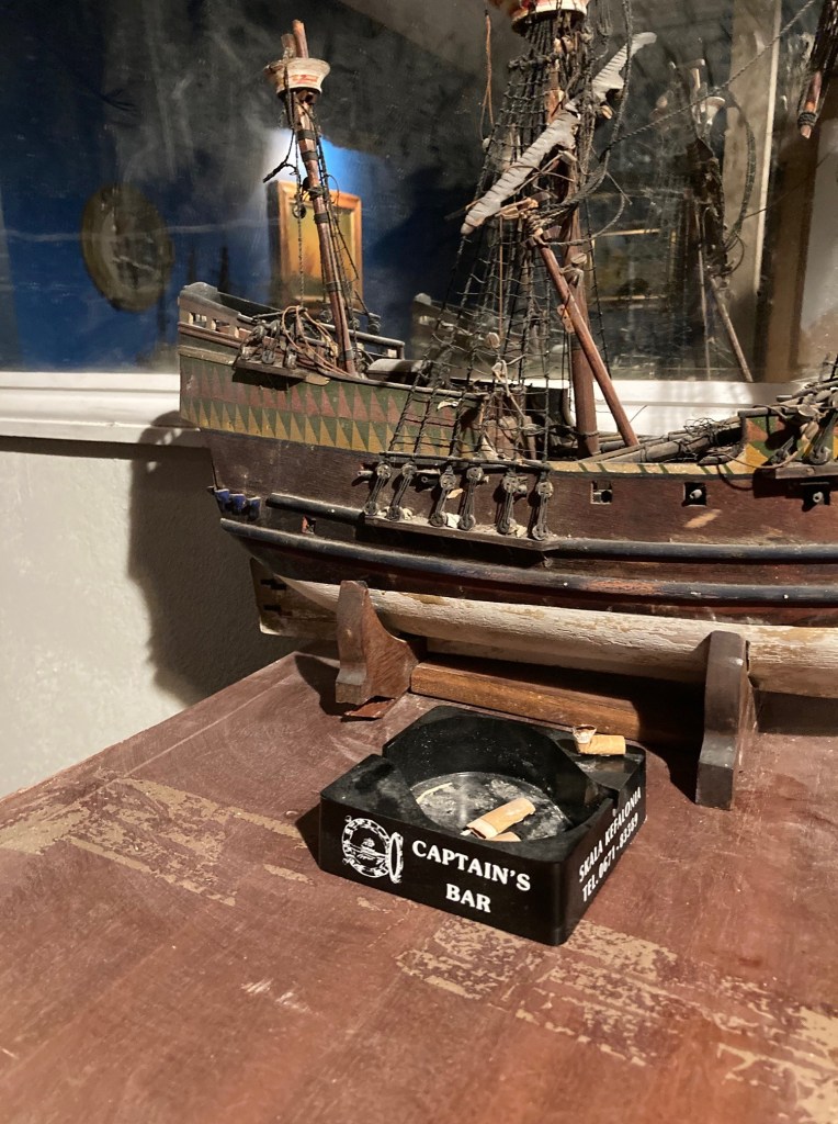 The most obvious encounter with this narrative is in the Captain’s Bar, a narrow blue room with an ashtray, models of the eponymous ships and a rifle for a door handle. The detail in the props, from tarot cards to animal skulls, brings to mind Punchdrunk shows, which probably annoys Nelson – his work predates the theatre, though his experiences inspire a similarly devoted following. Further spaces to encounter include a travel agency advertising cheap flights to Nairobi and Lagos, a room with floorboard benches littered with scraps of rags, and a staircase, from which you can glimpse the roof below the gallery ceiling, and its clutter of planks, cables, a dusty old television, bar stool and chicken wire.