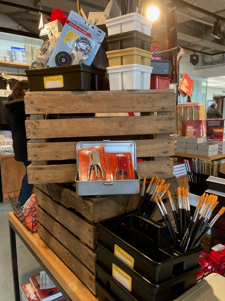 Industry is a recurring theme; the artist as worker, the tools of production. The curated selection of themed products in the Hayward’s gift shop therefore seems apt. You can inhabit a little of the artist’s world by buying a black beanie hat by Quinton + Chadwick. On the Extinction Beckons display there are label makers, retractable rulers, a tool caddy, an industrial looking stapler and a Penco notebook to sketch your own Ballardian dystopia. I bought the catalogue and a tote bag to carry it in. The bag is red with the show’s title, but I’m hesitant to use it on account of another coincidence – I understand Mike Nelson’s studio is very close to where I live in south London and I’ve seen him around. During lockdown, I saw him running up our road, in the hat. Proof that physically, at least, he inhabits the same world as the rest of us – it’s just the places he imagines and brings to life that suggest a curious mind elsewhere.
