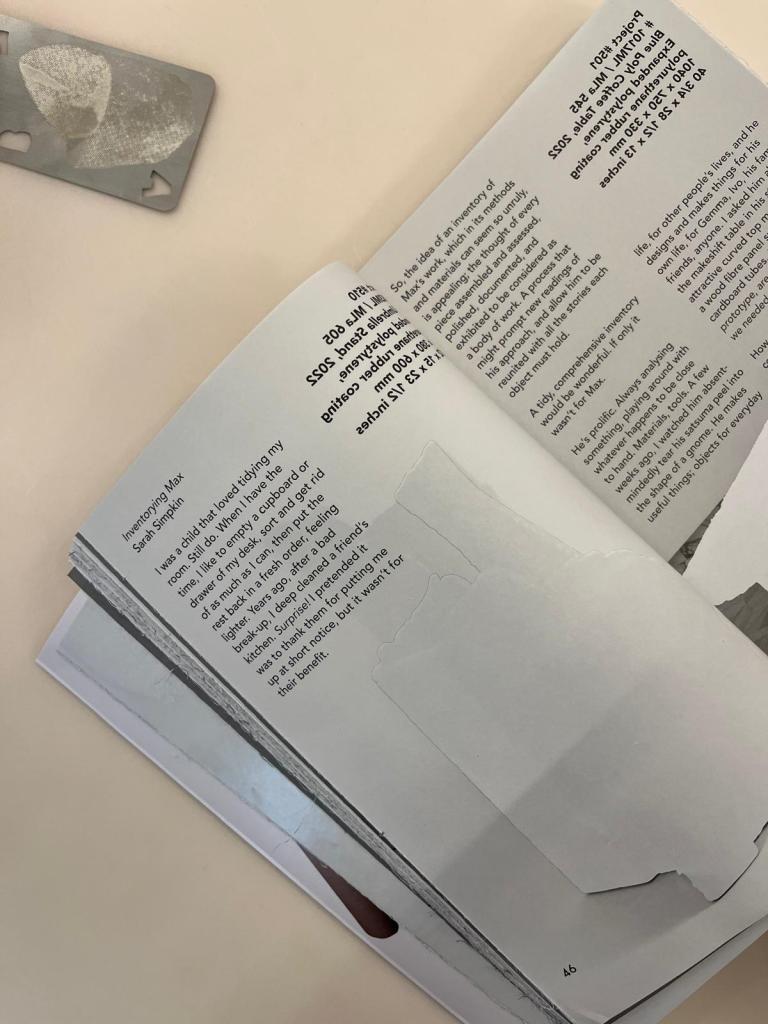 The book was produced as a catalogue for Max’s show at Salon 94 Design in New York earlier this year, which included more than 200 pieces – and like all books produced with graphic design collective åbäke, is a fantastically creative, tactile object. You need to cut or tear the pages to find the texts, and when you do, you create a lovely feathered edge. You’re basically a designer now too.