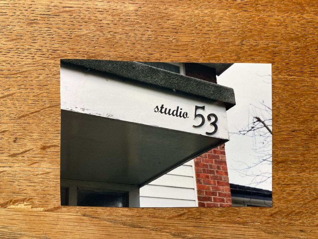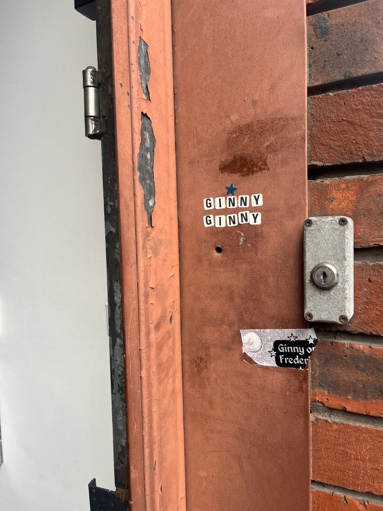The gallery feels like meanwhile space. If you look up the address, you find renderings for a future white tiled office block; an “art deco-warehouse design of concrete, glazed brick and faïence” that got planning permission two years ago, with a glass-fronted co-working lobby across the ground floor. The GINNY sticker on the brick claiming its occupation took me back to a garage in Stockport in the ‘90s, where Nicola Dale, Gemma Holt and I made a ‘studio’ sticker for our group show. We added it to the house number. The space met our sole imperatives of empty and free.