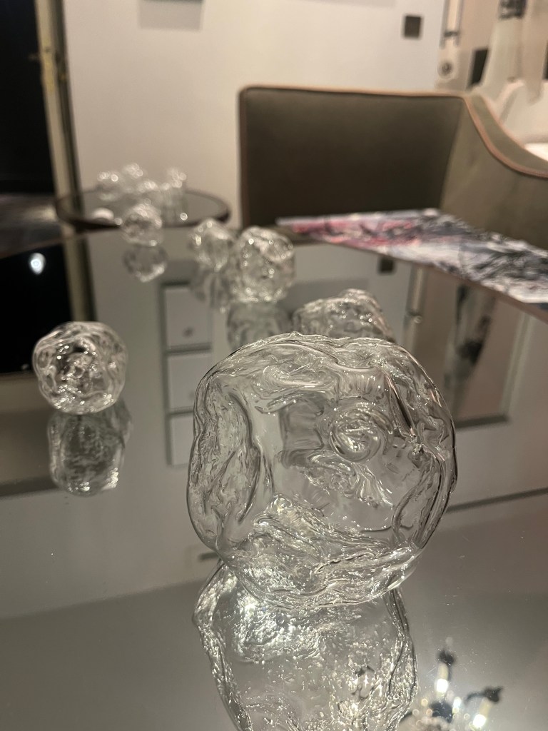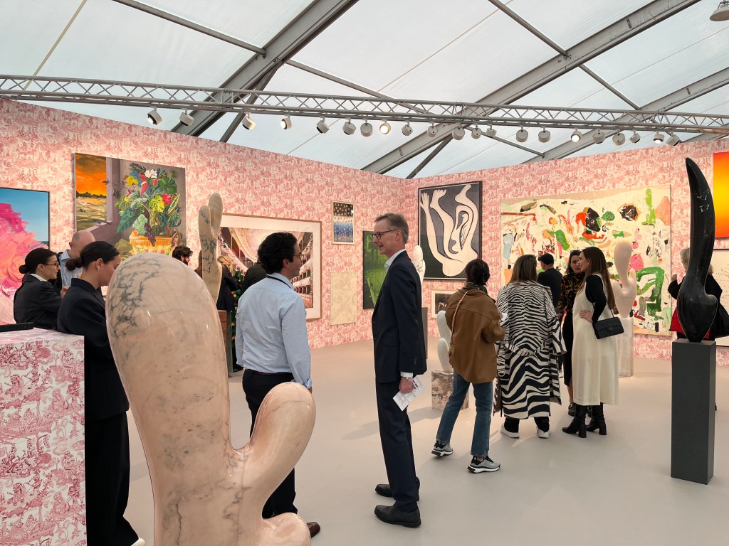 Away from Regent’s Park, fringe events like Minor Attractions in the Mandrake Hotel (designed by Manolo & White) give international galleries hotel bedrooms and staircases to work with. There’s a spray painting by Ramone “K” Anderson in the shower. Japanese artist, Taki Yokote is making lumps of rock levitate on the dressing table. In these confined spaces, artists’ ambitions can clash and visitors have to move awkwardly around the beds, forcing conversation. Some confine their displays to surfaces, with small acts, like Ana Sofia Esteva’s glass sculptures, each containing the breath of a word. More extravagantly, Edoardo Rito at Santi Gallery took the doors off the hotel wardrobes and covered them in plywood, enclosing all but a small shelf for poetry books.