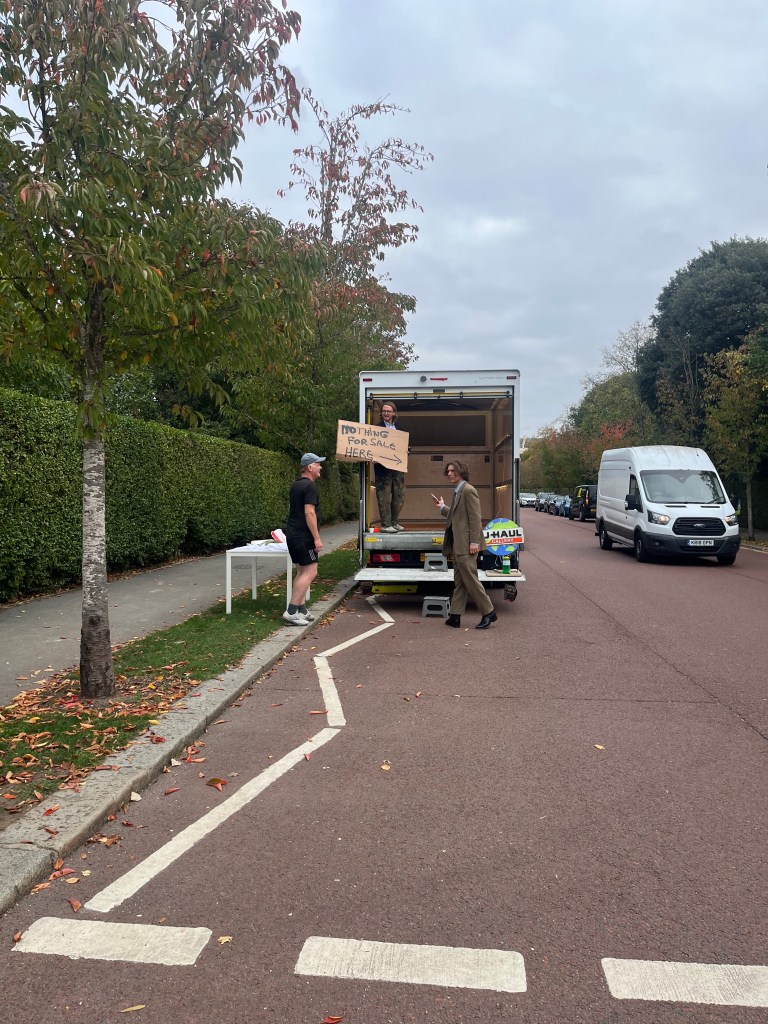 Ginny on Frederick isn’t an anomaly. Across London, some of the most interesting programmes are emerging from improvised retail and domestic spaces. Bobinska Brownlee New River exhibits upcoming and established names in a white cube in the garden of their Islington home. The Smallest Gallery in Soho, co-founded by Andreia Costa and Philip Levine, occupies a shop window, supported by The Garage Soho, Sir John Hegarty’s investment firm. The phone boxes by the British Museum hang pictures to attract passing tourists. Walking past The Approach’s Frieze stand, I thought of their rooms above a pub, a modest launchpad for so many careers. Fittingly, their group show included an intimately scaled painting by Mike Silva of a shower curtain drawn across a bath in the corner of an attic room. Leaving the tent, I pass U-Haul Gallery trying to navigate Camden parking.