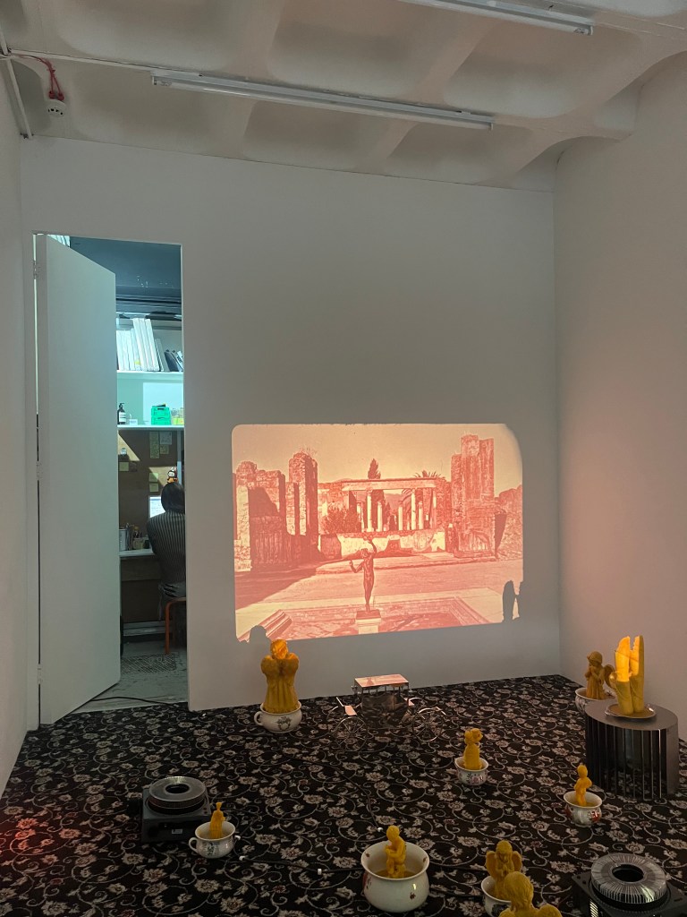 Away from Frieze, Ginny on Frederick has been showing Rebecca Ackroyd’s The Privy Window in its garage-sized unit under an office block on the edge of Smithfield Market. Approaching from the market, it’s easy to miss the entrance, a gap in a concertinaed metal door. The gallery’s first home in a former sandwich shop was even smaller. Immediately inside, a wooden cabinet makes for an improvised wall, hung with small paintings of wild dreams, such as a naked woman riding a giant worm. (Maybe she’d been to an art fair too.) The cramped situation amplifies the sense of Ackroyd’s fascination with internal worlds. Visitors pick their way carefully around beeswax angels and cherubs in ceramic chamber pots on the carpet as slide projectors click through photos of pop culture, cities, memories. I happened to look down at the moment an image flashed up of Diane Keaton with Goldie Hawn and Bette Midler in The First Wives Club, which felt poignant just a few days after Keaton had died. Another projector is frozen on a candle.